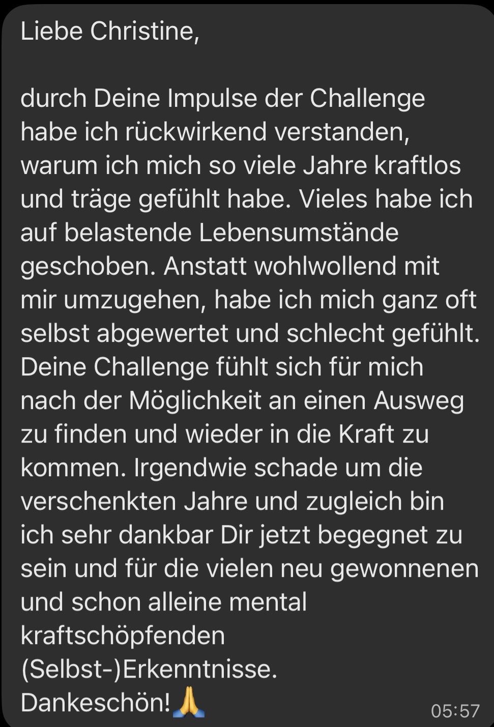 Die vierte Power-Session ist für deine Fragen. Außerdem ist in dieser Woche der nächste Energie-Check-in fällig. Lass uns genau auf deine Entwicklung schauen. Was klappt gut? Wo ist noch Potenzial?